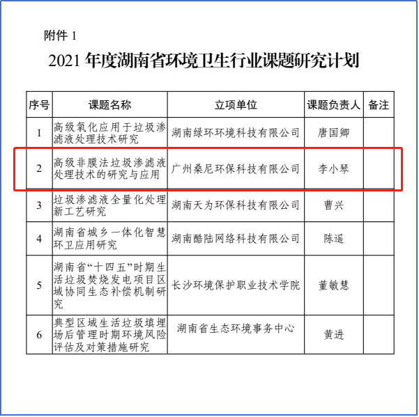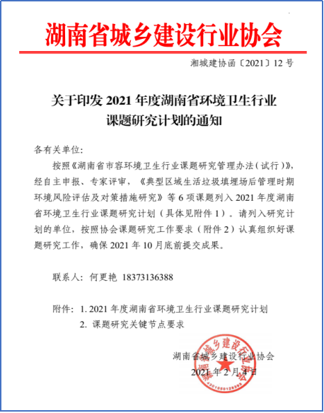 2021年2月4日,我司“高级非膜法垃圾渗滤液处理技术的研究与应用”课题列入 2021 年度湖南省环境卫生行业课题研究计划。