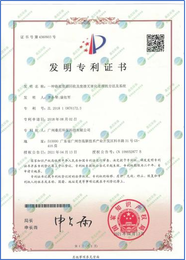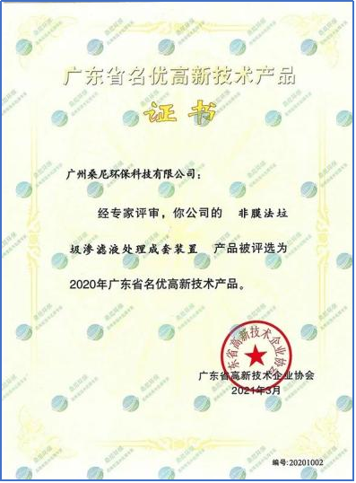 桑尼环保已申请和通过发明专利20余项,实用新型专利10余项,高新技术产品10余项,每年坚持自主研发新的专利技术和产品,不断创新。“非膜法垃圾渗滤液处理成套装置”评为广东省名优高新技术产品。